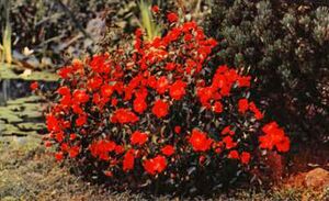 Mittelgroße, halbgefüllte Blüten in Büscheln, mit gelben Staubgefäßen. Ovaloide Knospen mit gefiederten und schmalblättrig überstehenden Kelchblättern. Öfterblühend.