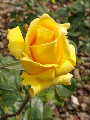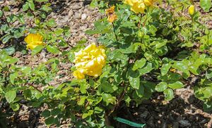 Große, gefüllte, gewölbte Blüten, edelrosenartig hoch erblühend. Ovaloide, gelbe Knospen mit schmalblättrig überstehenden Kelchblättern.Öfterblühend.
