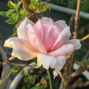 Große, locker gefüllte Blüten, edelrosenartig erbühend. Lange, hohe, pastellrosa Knospen. Gute Schnittrose. Öfterblühend.