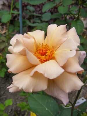 Sehr große (Ø 9,5 cm), halbgefüllte, gewölbt becherförmige Blüten mit orangen Staubgefäßen und großen Petalen. Große, spitzte, orange bis rosa Knospen mit lang und blättrig überstehenden Kelchblättern.. Öfterblühend.
