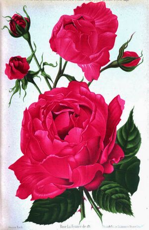 Nach unseren eigenen Beobachtungen finden wir, dass die Knospe viel länglicher als auf der Abbildung und die Farbe eher leuchtendrot als karmesinrot ist. Wenn die Blüte voll aufgeblüht ist, sind manchmal die Blütenblätter weiß umrandet. Übrigens hat La France de 89 in der Grundfarbe viel Ähnlichkeit mit Ulrich Brunner fils.