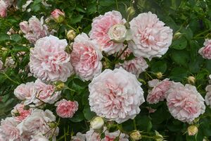 Große, dicht gefüllte, gewölbte Blüten. Sie erscheinen in kleinen Büscheln. Ovaloide, zartrosa Knospen mit schmalblättrig überstehenden Kelchblättern. Öfterblühend.
