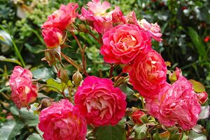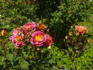 Mittelgroße, gefüllte, gewölbte Blüten in Gruppen. Kugelige, gespitzte, gelbe und rote Knospen. Öfterblühend.
