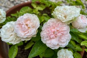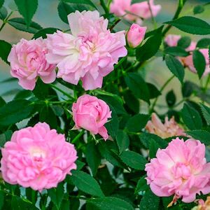 Kleine, stark gefüllte Blüten. Ovaloide, gespitzte, zartrosa Knospen. Öfterblühend.
