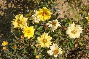 Kleine (Ø 3,8 cm), leicht halbgefüllte, flach schalenförmige Blüten mit gold-gelben Staubgefäßen. Sie erscheinen in Gruppen. Spitze, lange, gelbe Knospen mit schmalblättrig überstehenden Kelchblättern. Öfterblühend.