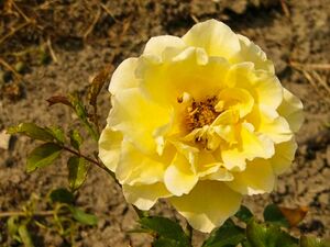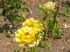 Große, gut halbgefüllte Blüten mit orange-roten Staubgefäßen. Kugelige, gespitzte, gelbe Knospen. Öfterblühend.