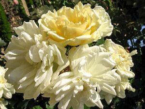 Große, halbgefüllte bis gefüllte, flach gewölbte Blüten in kleinen Gruppen. Lange, spitze Knospen. Öfterblühend.
