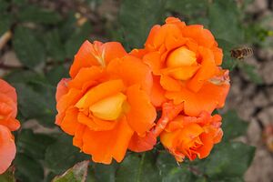 Mittelgroße (Ø 5,5 cm), gut gefüllte, schalenförmige Blüten, kugelförmig erblühend. Sie erscheinen in Gruppen. Kugelige, gspitzte, gelb-rote Knospen. Dunkelrote Staubgefäße. Öfterblühend.